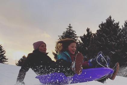 Chelsey being a trooper sledding with Maddie on hard pack snow!